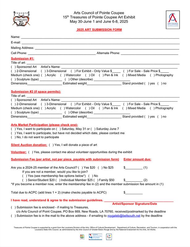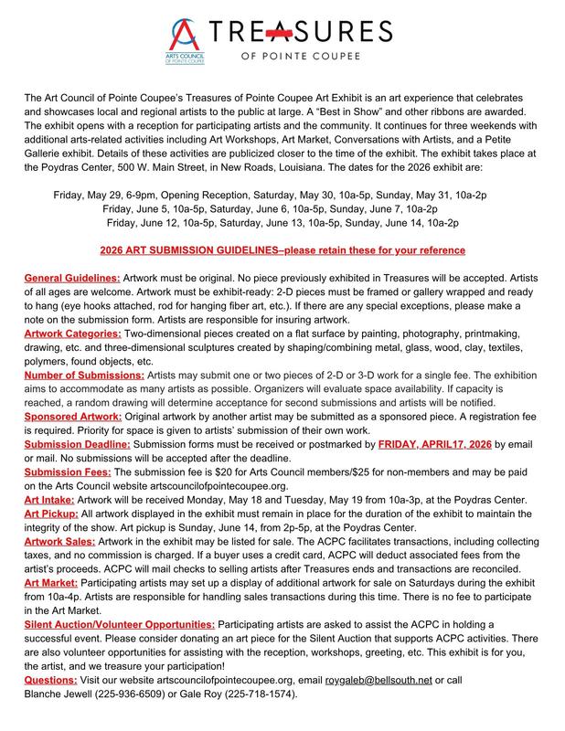 Treasures is sponsored by a grant from the Louisiana Division of the Arts, Office of Cultural Development, Department of Culture, Recreation, and Tourism, in cooperation with the Louisiana State Arts Council as administered by the Arts Counci of Greater Baton Rouge and by the National Endowment for the Arts, Art Works.